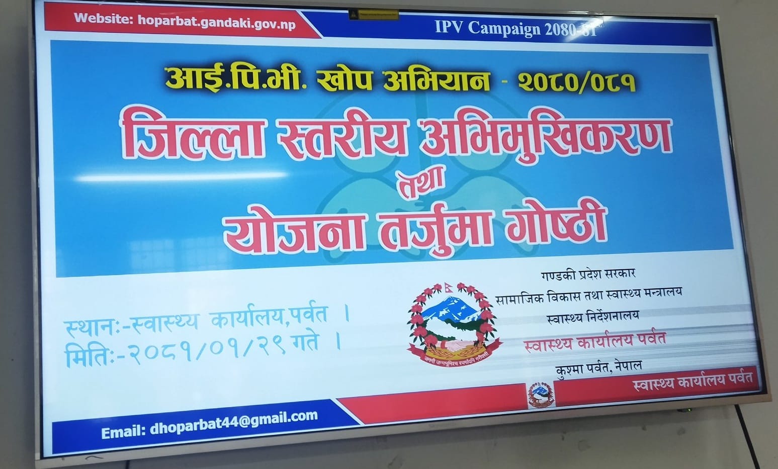 स्वास्थ्य कार्यालय पर्वतको आयोजनामा यही मिति २०८१ साल जेठ १३ गतेदेखि देशव्यापी रुपमा संचालन हुन गईरहेको पोलियो रोग विरुद्बको आई.पि.भि. खोप अभियान २०८०/८१ सम्बन्धी १ दिने अभिमुखिकरण तथा योजना तर्जुमा गोष्ठी सफलतापूर्वक सम्पन्न भएको छ । २०७३ साल बैशाख देखि २०७५ साल असोज भित्र जन्मिएका बालबालिकाहरुलाई तत्कालिन समयमा खोपको अभाव भई आई.पि.भि. खोप लगाउन छुटेका बालबालिकाहरुलाई लक्षित गरी संचालन गर्न लागिएको यस अभियानद्बारा पोलियो रोगको जोखिममा रहेका बालबालिकाहरुलाई आई.पि.भि. खोप प्रदान गरी पोलियो रोगबाट हुन सक्ने अपाङ्गता तथा मृत्युबाट जोगाउनुको साथै पोलियो रोगलाई संसारबाटै उन्मूलन गर्ने उद्देश्य अनुरुप उक्त कार्यक्रम संचालन भएको थियो । स्वास्थ्य कार्यालय पर्वतका प्रमुख एवं जन स्वास्थ्य अधिकृत श्री प्रबिण शर्माको अध्यक्षतामा संचालित उक्त कार्यक्रमको सहजिकरण स्वास्थ्य कार्यालय पर्वत का परिवार नियोजन सुपरभाइजर निरीक्षक श्री नारायण प्रसाद रेग्मी र कोल्ड चेन निरीक्षक श्री जयन्द्रमान गुरुङले गर्नुभएको थियो भने कार्यक्रममा मोदी गाउँपालिका र जलजला गाउँपालिका स्वास्थ्य शाखा प्रमुख, पालिका खोप फोकल पर्सन र स्वास्थ्य संस्थाका प्रमुखहरु गरि २१ जना स्वास्थ्य कर्मीको सहभागिता रहेको थियो ।