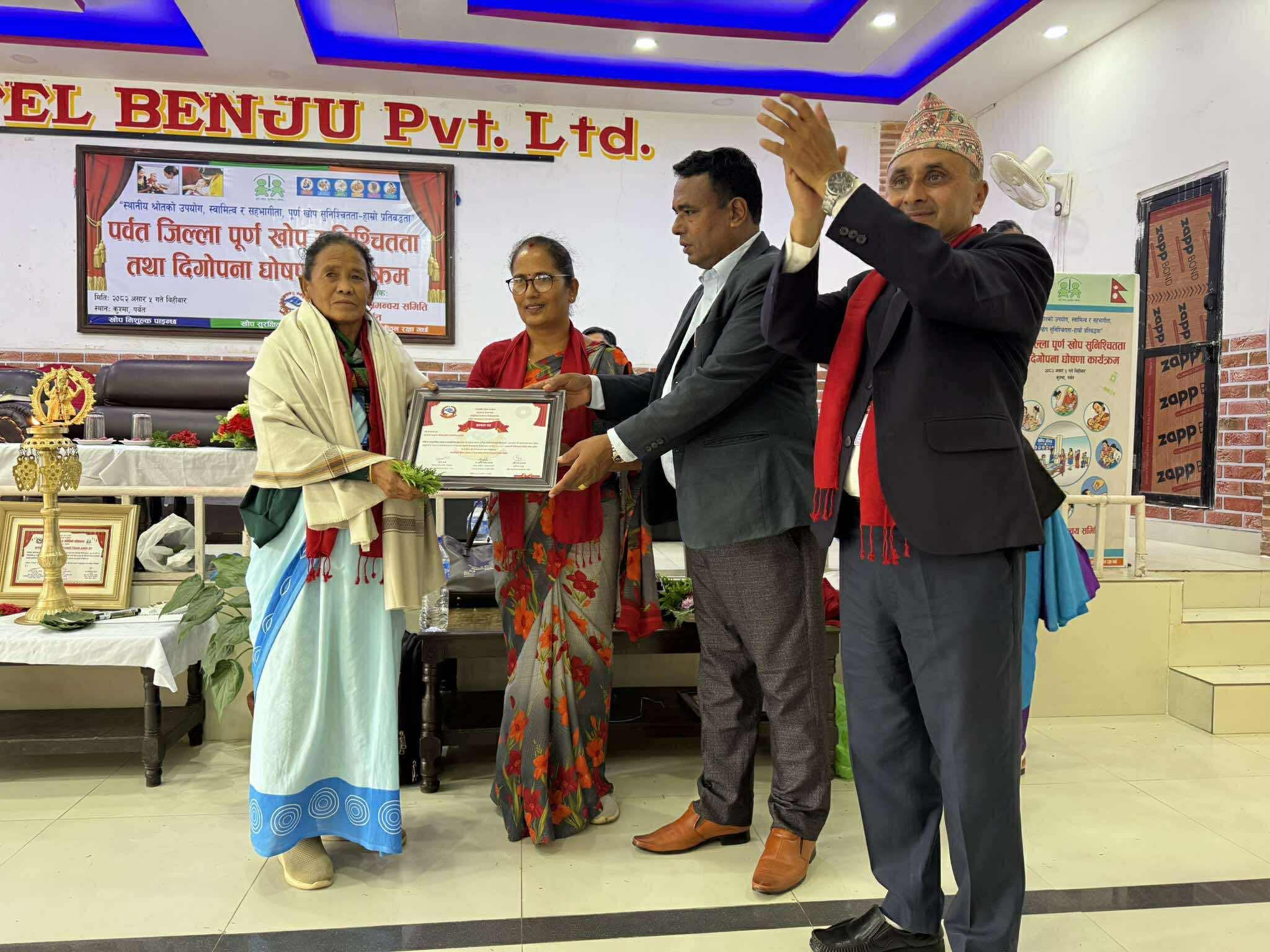 प्रदेश जनस्वास्थ्य कार्यालय पर्वतको आयोजनामा पर्वत जिल्ला पूर्ण खोप सुनिश्चितता तथा दिगोपना घोषणा कार्यक्रमको समारोहमा पर्वत जिल्लामा कार्यरत महिला सामुदायिक स्वास्थ्य स्वंय सेविकाहरूको लागि सम्मानजनक विदाई कार्यक्रम जिल्ला समन्वय समिति प्रमुख बिष्णुराम बि.क ज्यूको अध्यक्षतामा तथा प.हे.न.नि सुमन शर्माको सन्चालनमा सम्पन्न भएको छ । उमेरले ६० वर्ष पुग्नु भएका १२ जना र महिला सामुदायिक स्वास्थ्य स्वंय सेविका भइ रहदा दुखद निधन हुनुभएको २ जना गरि १४ जना महिला सामुदायिक स्वास्थ्य स्वंयसेविकाहरूलाई कदर पत्र वितरण गरि सम्मान गरिएको थियो । यस बिदाई अवसरमा तपाईंहरूले देखाउनुभएको साहस, धैर्य, मेहनत र मानवसेवा प्रतीको प्रतिबद्धतालाई हामी सधैं स्मरण गर्नेछौं। नेपालको स्वास्थ्य प्रणालीलाई बलियो बनाउन तपाईंहरूले जुन भूमिका निर्वाह गर्नुभयो, त्यसको लागि हामी हृदयदेखि नै धन्यवाद दिन चाहन्छौं। आगामी दिनहरूमा शान्ति, स्वास्थ्य र सफलता रहोस् भन्ने कामना व्यक्त गर्दछौं।महिला सामुदायिक स्वास्थ्य स्वयंसेविकाको रुपमा रहि तपाइँहरुले समुदाय स्तरमा पुराउनु भएको योगदानको प्रदेश जनस्वास्थ्य कार्यालय पर्वतको तर्फबाट उच्च सम्मान गर्दछौं साथै सेवानिवृत्त जीवन सुखद रहोस् भनी सुभकामना पनि दिन चाहान्छौ । निधन हुनुभएका महिला सामुदायिक स्वास्थ्य स्वंय सेविकाहरू प्रति यस दुःखद घडीमा उहाँप्रति हार्दिक श्रद्धाञ्जली अर्पण गर्दै शोकसन्तप्त परिवारजनप्रति गहिरो समवेदना व्यक्त गर्दछौं।