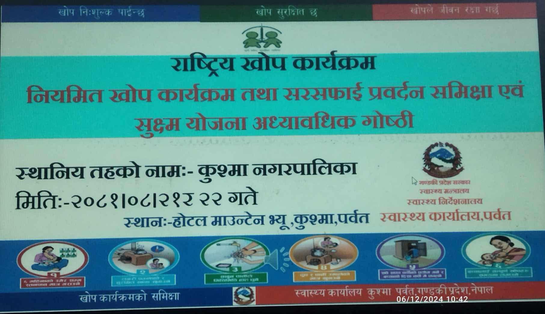 स्वास्थ्य कार्यालय पर्वतको आयोजना तथा कुश्मा नगरपालिकाकाे समन्वयमा मिति २०८१ मंसिर २१ गते देखि २२ गते सम्म होटल माउण्टेन भ्यू कुश्मामा कुश्मा नगरपालिका स्तरीय नियमित खोप कार्यक्रम तथा सरसफाई प्रवर्धन कार्यक्रमकाे समीक्षा तथा सुक्ष्म योजना गोष्ठी सम्पन्न भएको छ । २ दिन सम्म संचालन भएको कार्यक्रमकाे अध्यक्षता स्वास्थ्य कार्यालय पर्वतका कार्यालय प्रमुख श्री प्रवीण शर्माले गर्नु भएको थियो भने कार्यक्रम काे प्रमुख आतिथ्यता कुश्मा नगरपालिकाका प्रमुख प्रशासकीय अधिकृत श्री नेत्र प्रसाद पौडेलले गर्नु भएको थियो । कुश्मा नगरपालिका अन्तर्गतका सबै प्रा स्वा के,स्वास्थ्य चौकी ,आधारभूत स्वास्थ्य सेवा केन्द्रका प्रमुख,खोप सेवामा संग्लन स्वास्थ्यकर्मी, शहरी स्वास्थ्य केन्द्रका प्रमुख तथा प्रतिनिधि, स्वास्थ्य शाखामा कार्यरत स्वास्थ्यकर्मी ,पर्वत अस्पतालका स्वास्थ्य कर्मी गरी ५० जना स्वास्थ्यकर्मीकाे सहभागीतामा कार्यक्रम सञ्चालन भएको थियो। कार्यक्रमकाे सहजिकरण स्वास्थ्य निर्देशनालय गण्डकी प्रदेशका खोप अधिकृत श्री एकनारायण लम्साल, फलेबास नगरपालिकाका स्वास्थ्य शाखा प्रमुख श्री रुद्र शर्मा सापकोटा, कुश्मा नगरपालिकाका स्वास्थ्य शाखा प्रमुख श्री याम प्रसाद शर्मा,स्वास्थ्य कार्यालय पर्वतका परिवार नियोजन सुपरभाईजर निरीक्षक नारायण प्रसाद रेग्मी, स्वास्थ्य कार्यालय पर्वतका जनस्वास्थ्थ अधिकृत ममता ढकालले गर्नु भएको थियो।