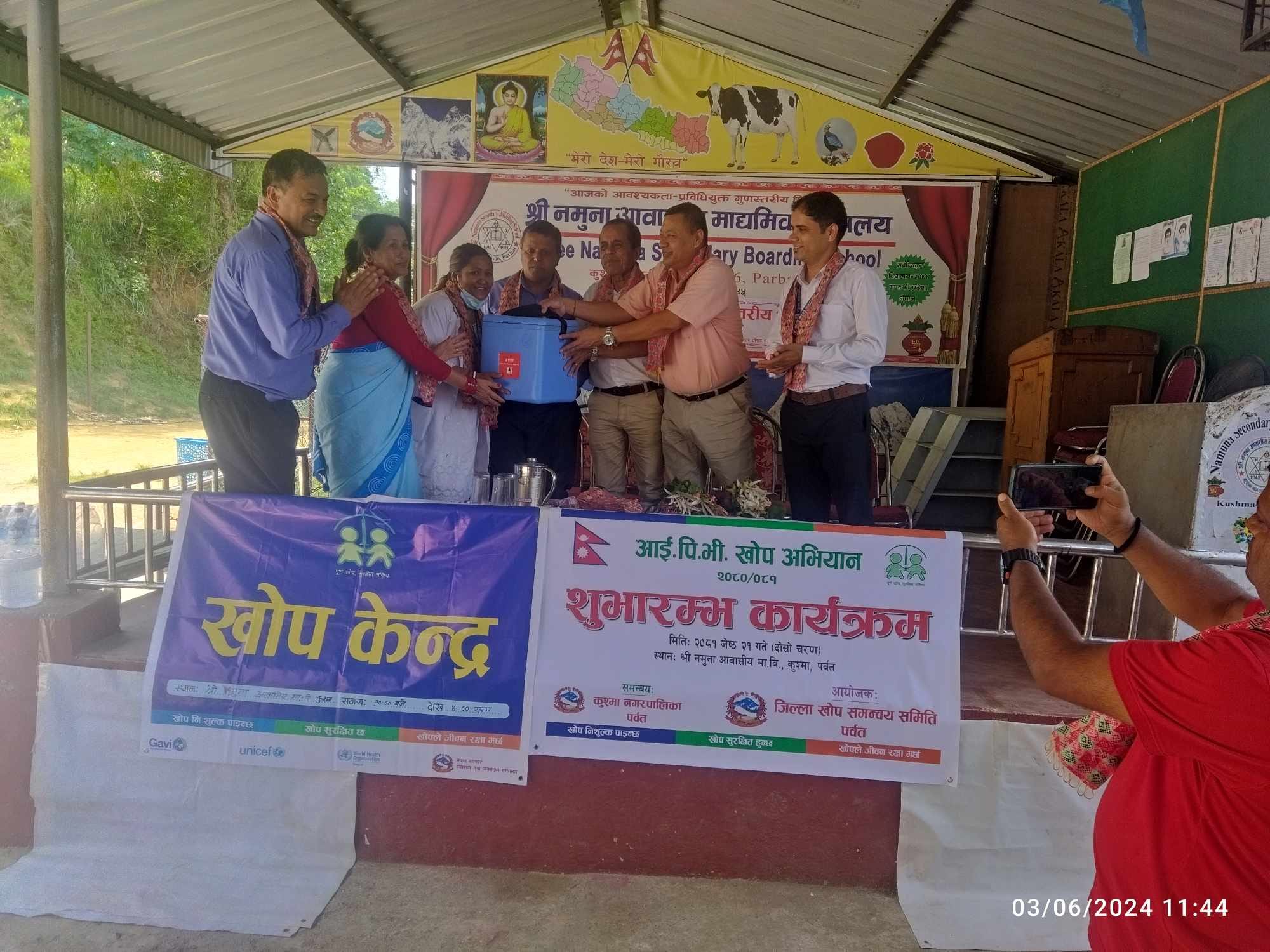 IPV खोप अभियान 2081काे दोस्रो चरणको शुभारंभ कुश्मा नगरपालिकामा श्री नमूना आवासीय मा.वि. खोप केन्द्रमा कुश्मा नगर पालिकाका नगर प्रमुख यवम कुश्मा नगर खोप समन्वय समितिका संयोजक श्री राम चन्द्र जोशी ज्यूकाे प्रमूख आतिथ्यता र कुश्मा नगरपालिका वडा नं 7 का वडा अध्यक्ष श्री परशुराम पूरीकाे अध्यक्षता र स्थानिय जनप्रतिनिधि र शिक्षक ,विद्यार्थीको उपस्थितिमा सम्पन्न भयो । सो कार्यक्रमकाे सन्चालन कुश्मा नगरपालिका वडा नं 7 का जन स्वास्थ्य निरीक्षक श्री सागर पौडेलले गर्नु भएको थियो ।स्वास्थ्य शाखा प्रमुख श्री याम प्रसाद शर्मा स्वागत यवम कार्यक्रमकाे बारेमा जानकारी दिनु भएको थियो भने कार्यक्रममा सहजीकरण स्वास्थ्य कार्यालय पर्वतका परिवार नियोजन सुपरभाईजर निरिक्षक श्री नारायण प्रसाद रेग्मीले गर्नु भएको थियो। कुश्मा नगरपालिका, मोदी गाउँपालिका र जलजला गाउँ पालिकाका सबै बिद्यालय र स्वास्थ्य संस्थाहरुबाट मिति 2081/02/21 गते देखि 2081/02/26 गते सम्म आई पी भी खोप अभियान सञ्चालन हुनेछ। थप जानकारीको लागि स्थानिय जनप्रतिनिधि र स्वास्थ्यकर्मी सँग सम्पर्क गर्न सक्नुहुनेछ।