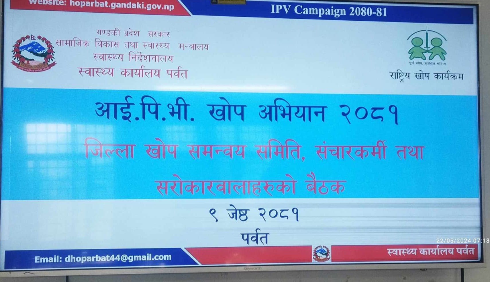 स्वास्थ्य कार्यालय पर्वतको आयोजना तथा जिल्ला समन्वय समिति पर्वतको समन्वयमा यही मिति २०८१ साल जेठ ९ गते बुधबार संचालन गरिएको पोलियो रोग विरुद्बको खोप अभियान २०८०/०८१ सम्बन्धी जिल्ला खोप समन्वय समिति एवं सरोकारवालाहरु र संचारकर्मीहरुको लागि अभिमुखिकरण गोष्ठी सफलतापूर्वक सम्पन्न भएको छ । विशेष गरेर सरोकारवालाहरु र संचारकर्मीहरुलाई यही जेठ १३ गते देखि संचालन हुन गईरहेको आई.पि.भी. खोप अभियान सम्बन्धमा जानकारी गराई अभियानलाई सफलतापूर्वक सम्पन्न गर्ने उद्देश्य अनुरुप उक्त कार्यक्रम संचालन भएको थियो । जिल्ला समन्वय समितिका प्रमुख तथा जिल्ला खोप समन्वय समितिका संयोजक आदरणीय श्री विष्णु राम विक ज्यूको अध्यक्षतामा संचालित उक्त कार्यक्रममा स्वास्थ्य कार्यालय पर्वतका प्रमुख श्री प्रबिण शर्माले स्वागत तथा कार्यक्रमको उद्देश्य माथि प्रकाश पार्दै खोप कार्यक्रमको संवेदनशिलताको बारेमा बुझिदिन आग्रह गर्दै खोप अभावका कारण जोखिममा रहेका ( खोपबाट बञ्चित २०७३ बैशाखदेखि २०७५ असोज भित्र जन्मिएका) बालबालिकाहरुलाई नजिकको खोप केन्द्रमा लगि खोप लगाउन अनुरोध गर्नुभएको थियो । स्वास्थ्य कार्यालय पर्वतका परिवार नियोजन सुपर भाईजर निरीक्षक श्री नारायण प्रसाद रेग्मीले संचालन गर्नुभएको थियो। उक्त कार्यक्रमको सहजिकरण स्वास्थ्य कार्यालय पर्वतका प्रमुख श्री प्रबिण शर्माले गर्नुभएको थियो ।
