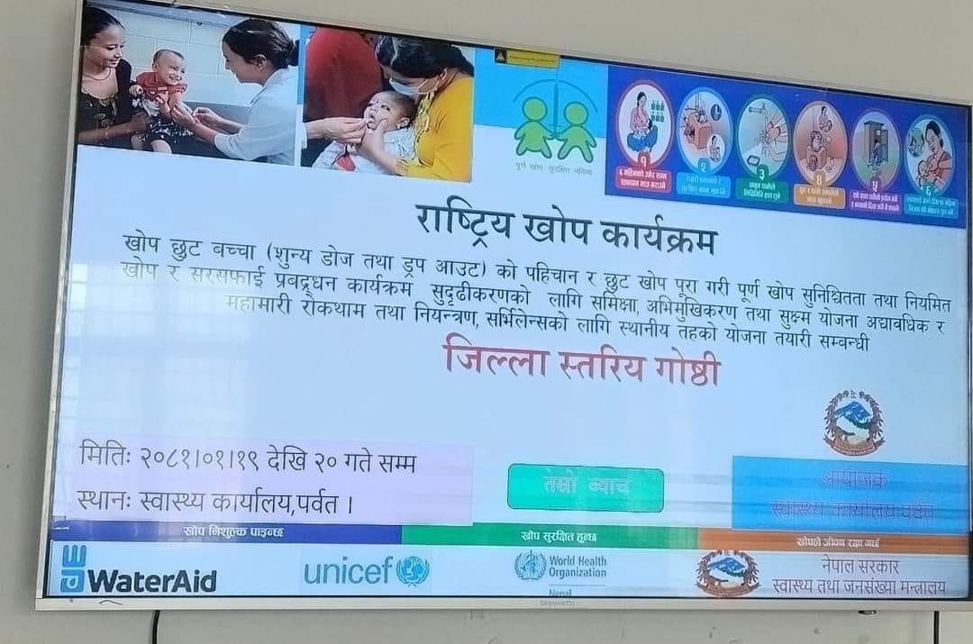 स्वास्थ्य कार्यालय पर्वतको आ. व. २०८०/०८१ काे वार्षिक स्वीकृत कार्यक्रम अनुसार स्वास्थ्य कार्यालय पर्वतको आयोजनामा मोदी गा.पा. र जलजला गा.पा.का स्वास्थ्य शाखा प्रमुख, खोप सम्पर्क व्यक्ति तथा अन्तर्गतका स्वास्थ्य संस्था प्रमुख तथा कुश्मा, फलेबास, महाशिला र पयू गा.पा. स्वास्थ्यकर्मी गरी ३० जनाकाे सहभागितामा खोप छुट बच्चा(शुन्य तथा ड्रप आउट ) काे पहिचान र छुट खोप पूरा गरि पूर्ण खोप सुनिश्चितता तथा नियमित खोप र सरसफाई प्रवर्धन कार्यक्रमकाे सुदृढीकरण का लागी समीक्षा, अभिमुखीकरण तथा शुक्ष्म याेजना अद्यावधिक र महामारी रोकथाम तथा नियन्त्रण यवम सर्भिलेन्स का लागि स्थानिय तहकाे याेजना तयारी सम्बन्धी जिल्ला स्तरीय गोष्ठी सम्पन्न भएको छ। सो कार्यक्रमकाे अध्यक्षता स्वस्थ्य कार्यालय पर्वतका अधिकृत प्रशासन श्री रघुनाथ रेग्मीले गर्नु भएको थियो भने सञ्चालन स्वास्थ्य कार्यालय पर्वतका परिवार नियोजन सुपरभाईजर निरीक्षक श्री नारायण प्रसाद रेग्मीले गर्नु भएको थियो। त्यसै गरी कार्यक्रमकाे सहजीकरण पोखरा महानगर पालिकाका जनस्वास्थ्य निरिक्षिक श्री तेजाखर लम्सालले गर्नु भएको थियो। साथै कार्यक्रमकाे व्यवस्थापन स्वास्थ्य कार्यालय पर्वतका कोल्ड चेन निरीक्षक श्री जयन्द्रमान गुरुङ्गले गर्नु भएको थियो।