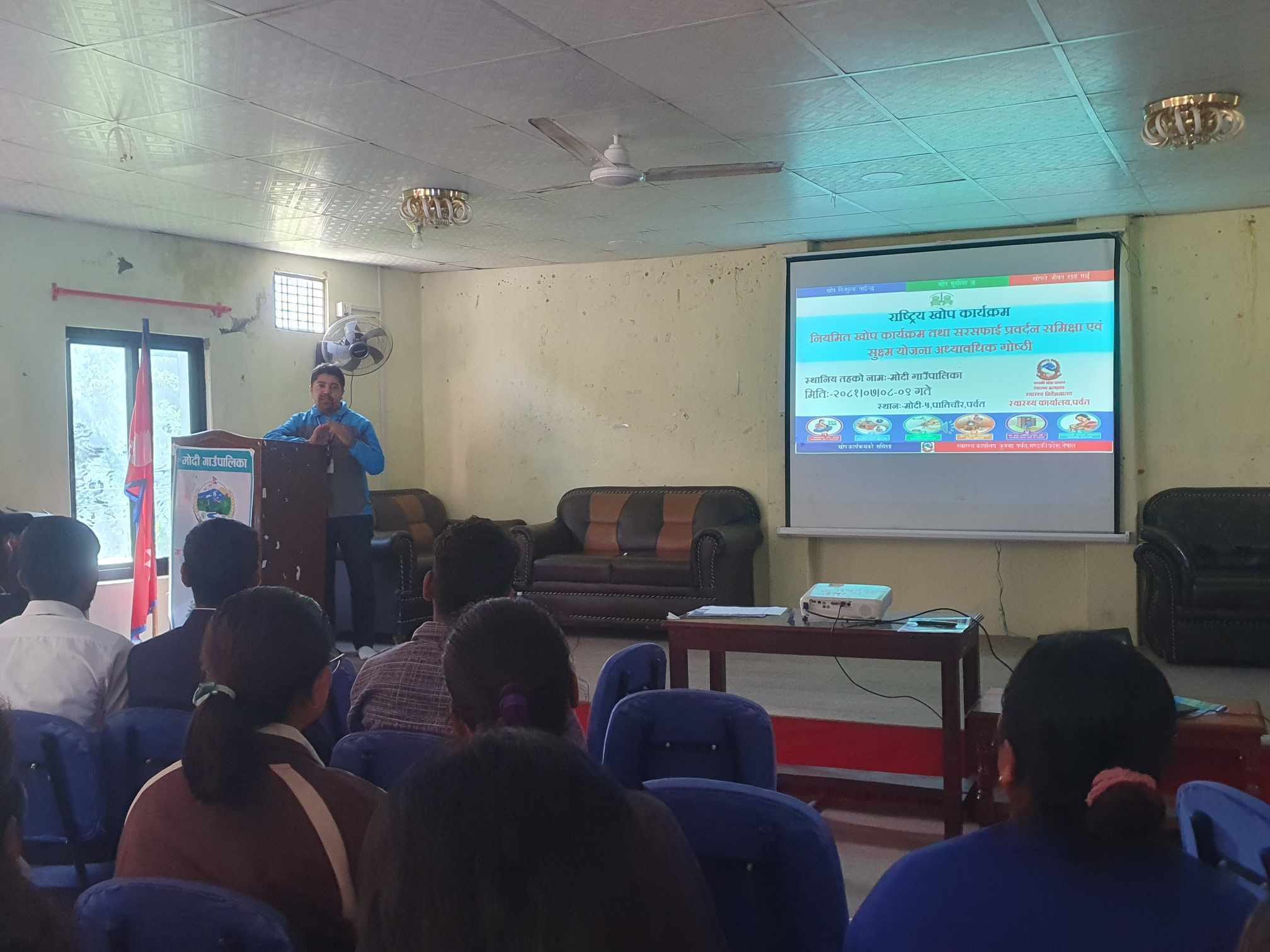 स्वास्थ्य कार्यालय, पर्वतको आयोजना र मोदी गाउँ पालिका स्वास्थ्य शाखाकाे समन्वयमा नियमित खोप कार्यक्रम तथा सरसफाई प्रवर्द्धनकाे समिक्षा तथा सुक्ष्मयोजना अध्यावधिक गोष्ठी गाउँपालिकमा सम्पन्न भएको छ। उक्त कार्यक्रम स्वास्थ्य कार्यालय पर्वतका कार्यालय प्रमुख श्री प्रवीण शर्माकाे अध्यक्षता र मोदी गाउँपालिकाका उपाध्यक्ष श्री विमल लामिछानेकाे प्रमुख आथीत्यता, सामाजिक विकास समिति संयोजक श्री सुक बहादुर गुरुङ,स्वास्थ्य निर्देशनालय गण्डकी प्रदेश पोखराका खोप अधिकृत श्री एकनारायण लम्साल,WHO/IPD पोखराका Servilance lmmunization medical officer श्री डा स्मृति लामा,युनिसेफका प्रतिनिधि ,मोदी गाउँ पालिकाका प्रशासकीय अधिकृत श्री प्रवीण पोख्रेल मोदी गाउँ पालिका स्वास्थ्य शाखा प्रमुख श्री उमेश कुमार अधिकारीकाे आतिथ्यता र मोदी गाउँ पालिका अन्तर्गतको स्वास्थ्य संस्था प्रमुख, सामुदायीक स्वास्थ्य इकाई का प्रमुख तथा प्रतिनिधि र खोप सेवा प्रदान गर्ने स्वास्थ्य कर्मीकाे सहभागीतामा कार्यक्रम सञ्चालन भएको थियो। 2 दिन सम्म सञ्चालन भएको सो कार्यक्रममा स्वास्थ्य निर्देशनालय पोखराका खोप अधिकृत एकनारायण लम्साल,WHO/IPD का SIMO स्मृति लामा, जनस्वास्थ्य अधिकृत ममता ढकाल, जनस्वास्थ्य निरिक्षक प्रकाश गौतम,परिवार नियोजन सुपर भाईजर निरिक्षक श्री नारायण प्रसाद रेग्मी र मोदी गाउँपालिका स्वास्थ्य शाखा प्रमुख श्री उमेश कुमार अधिकारीले सहजिकरण गर्नु भएको थियो ।उक्त कार्यक्रममा मोदी गाउँपालिका अन्तर्गत सबै स्वास्थ्य संस्था बाट स्वास्थ्य संस्था प्रमुख र खोप दिने स्वास्थ्यकर्मी गरी 35 जना स्वास्थ्यकर्मीहरुकाे सहभागिता रहेको थियो ।