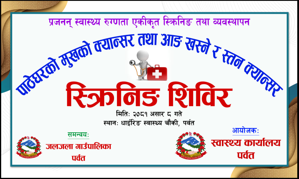 स्वास्थ्य कार्यालय पर्वतकाे आयाेजना र जलजला गाउँपालिकाकाे समन्वयमा माहिलाहरुको लागि निशुल्क स्क्रिनिङ शिविर जलजला गाउँपालिकाका उपाध्यक्ष दिपक आचार्यको अध्यक्षतामा र स्वास्थ्य कार्यालय पर्वतका प.हे.न.नि सुमन शर्माको ब्यवस्थापनमा र जनस्वास्थ्य अधिकृत अन्जली पि.सिको संचालनमा धाइरिङ स्वास्थ्य चौकीमा सम्पन भएको छ । पर्वत अस्पतालबाट स्त्री रोग बिषेशज्ञ डा सन्तोषी थपलिया, एमडीजपि डा मिलान अवाले, ब.अ न.नि स्वरस्वती बराल , कुश्मा नगरपालिकाका सि.अ.न.मी दुर्गा सापकोटा ,जलजला गा.पा स्वाथ्य शाखाका सि.अ .न .मी अन्जली बैरागी ,VIA तालिम प्राप्त स्वास्थ्यकर्मी शान्ती शर्मा, राधा शर्मा र दिलु रिजाल सहितको टिमको उपस्थितीमा सेवा प्रवाह गरिएको उक्त शिविरमा १०२जनाले सेवा लिनु भएको थियो जसमा ८५ जना मा VIA बिधि मार्फत पाठेघरको मुखको क्यान्सरको स्क्रिनिङ र स्तन क्यान्सरको स्क्रिनिङ गरिएको थियो जसमध्ये ४ जनामा VIA positive आएको छ ! ६ जनाको आङ खस्ने समस्याको ब्यवस्थापन गरि पोखरा स्वास्थ्य बिज्ञान प्रतिस्ठानमा प्रेषण गरिएकाे थियो । शिविर सञ्चालन र सम्पन्न गर्न सहयोग गर्नु हुने सम्पूर्ण सबै लाई स्वास्थ्य कार्यालय पर्वतको तर्फबाट बिषेश धन्यवाद व्यक्त गर्दछौ ।
