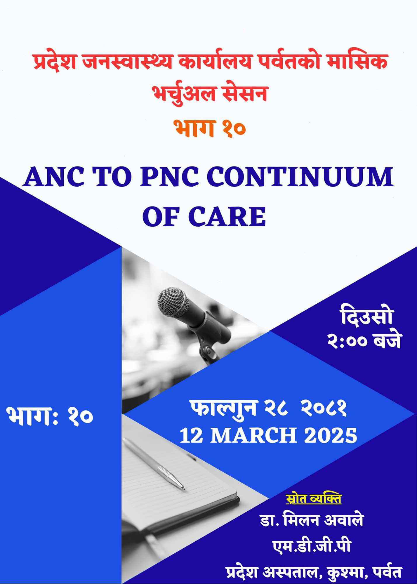 प्रदेश जनस्वास्थ्य कार्यालय पर्वतद्वारा शुन्य लागतमा शुरु भएको मासिक भर्चुअल सेसन भाग १० अन्तर्गत २०८१ फाल्गुन महिनाको सेसन "ANC to PNC continuum of care " शिर्षकमा सम्पन्न भएको छ । उक्त सेसनको संचालन प्रदेश जनस्वास्थ्य कार्यालय पर्वतका प. हे.नि.नि सुमन शर्माले गर्नु भएको थियो भने सहजीकरण प्रदेश अस्पताल, कुश्मा, पर्वतका MDGP डा. Milan Awale ले गर्नुभएको थियो । १ घन्टा भन्दा लामो सेसनमा जिल्लाका विभिन्न स्वास्थ्य संस्था बाट जुम आइडी मार्फत करिव ४० जना भन्दा बढी स्वाथ्यकर्मीहरुको सहभागिता रहेको थियो ।