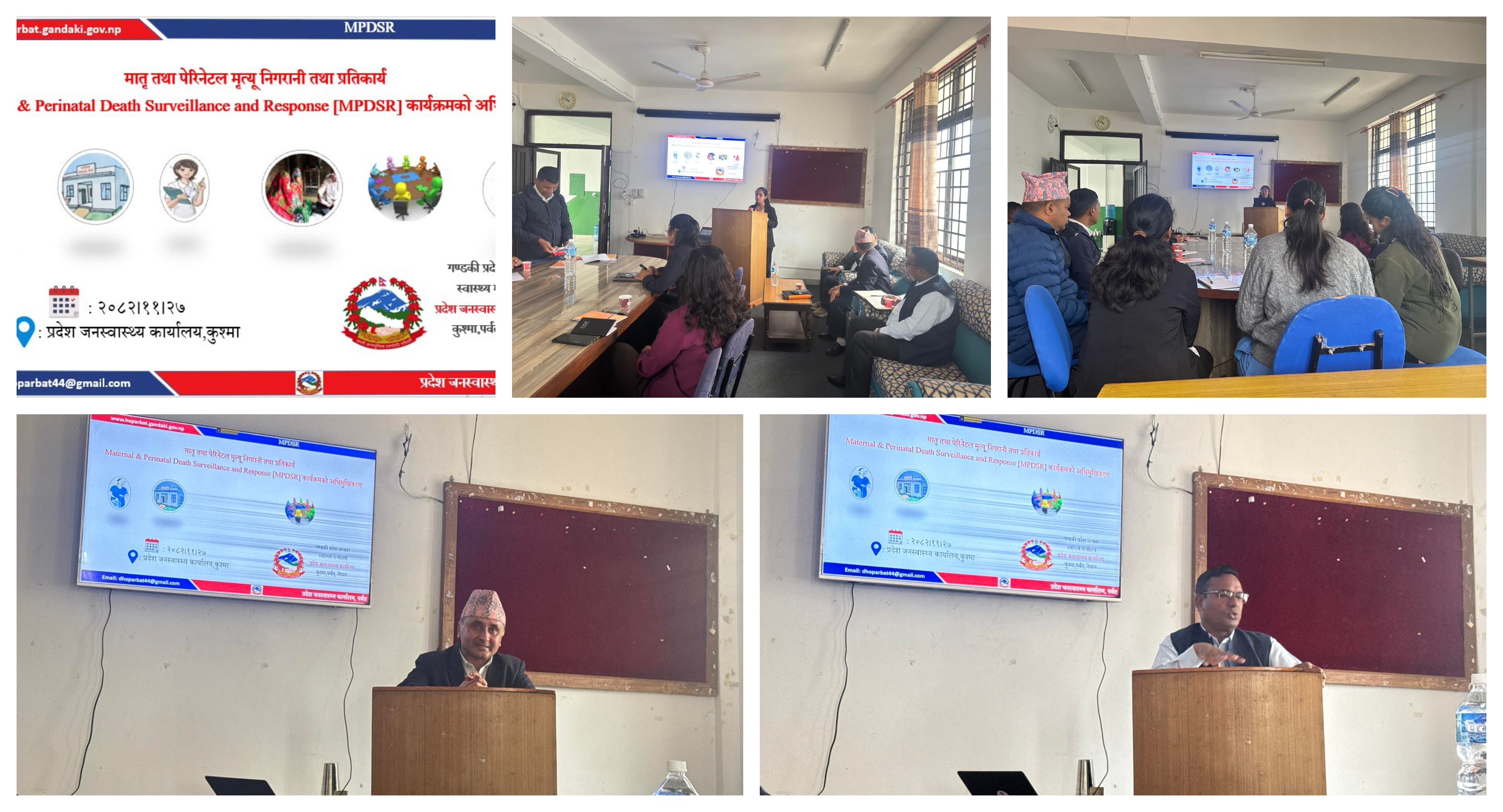प्रदेश जनस्वास्थ्य कार्यालय पर्वतको आयोजनामा मिति २०८२/११/२७ गते समुदाय स्तरमा मातृ तथा पेरिनेटल मृत्यु निगरानी तथा प्रतिकार्य कार्यक्रम निरन्तरता तथा विस्तार कार्यक्रको अभिमुखिकरण MPDS समितिको सदस्य तथा स्वास्थ्य कार्यालयका कर्मचारीहरुलाई १ दिने अभिमुखिकरण MPDSR समितिको अध्यक्ष श्री विष्णुराम वि.क ज्यूको अध्यक्षतामा प्रदेश जनस्वास्थ्य कार्यालय पर्वतको सभाहलमा सम्पन्न भएको थियो । अभिमुखिकरणमा प्रदेश अस्पताल कुश्माका मे,सू डा ढुन्डीराज पौडेल , प्रदेश जनस्वास्थ्य कार्यालय पर्वतको कार्यालय प्रमुख बद्रीराज आचार्य, प्रदेश अस्पताल कुश्माका एम.डि.जि.पी डा मिलन अवाले सहित १२ जनाको उपस्थिति रहेको थियो ।