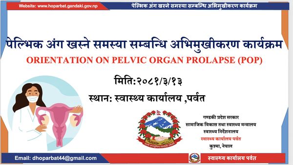 स्वास्थ्य कार्यालय पर्वतको आयोजनामा नर्सिङ कर्मचारीहरुको लागि Pelvic organ prolapse सम्बन्धि अभिमुखिकरण कार्यक्रम सम्पन्न भएको छ ! कार्यक्रम स्वास्थ्य कार्यालय पर्वतका नि कार्यालय प्रमुख रघुनाथ रेग्मि ज्यूको अध्यक्षतामा संचालन भएको थियो जसमा जम्मा ३१ जना नर्सिङ कर्मचारीहरुको सहभागीता रहेको थियो। कार्यक्रममा pelvic organ prolapse को पहिचान र व्यवस्थापन , Kegel exercise , रिङ पेशरी, अभिलेख प्रतिबेदन जस्ता महत्त्वपूर्ण विषयमा छलफल भएको थियो जसलाई पर्वत अस्पताल कुश्माका स्त्री रोग विशेषज्ञ डा. सन्तोषी थपलियाज्यू, वरिष्ठ अस्पताल नर्सिङ निरीक्षक सरस्वती वरालज्यू , जनस्वास्थ्य अधिकृत अन्जली पि.सिज्यू र पब्लिक हेल्थ नर्सिङ निरीक्षक सुमन शर्माले सहजीकरण गर्नुभएको थियो ।