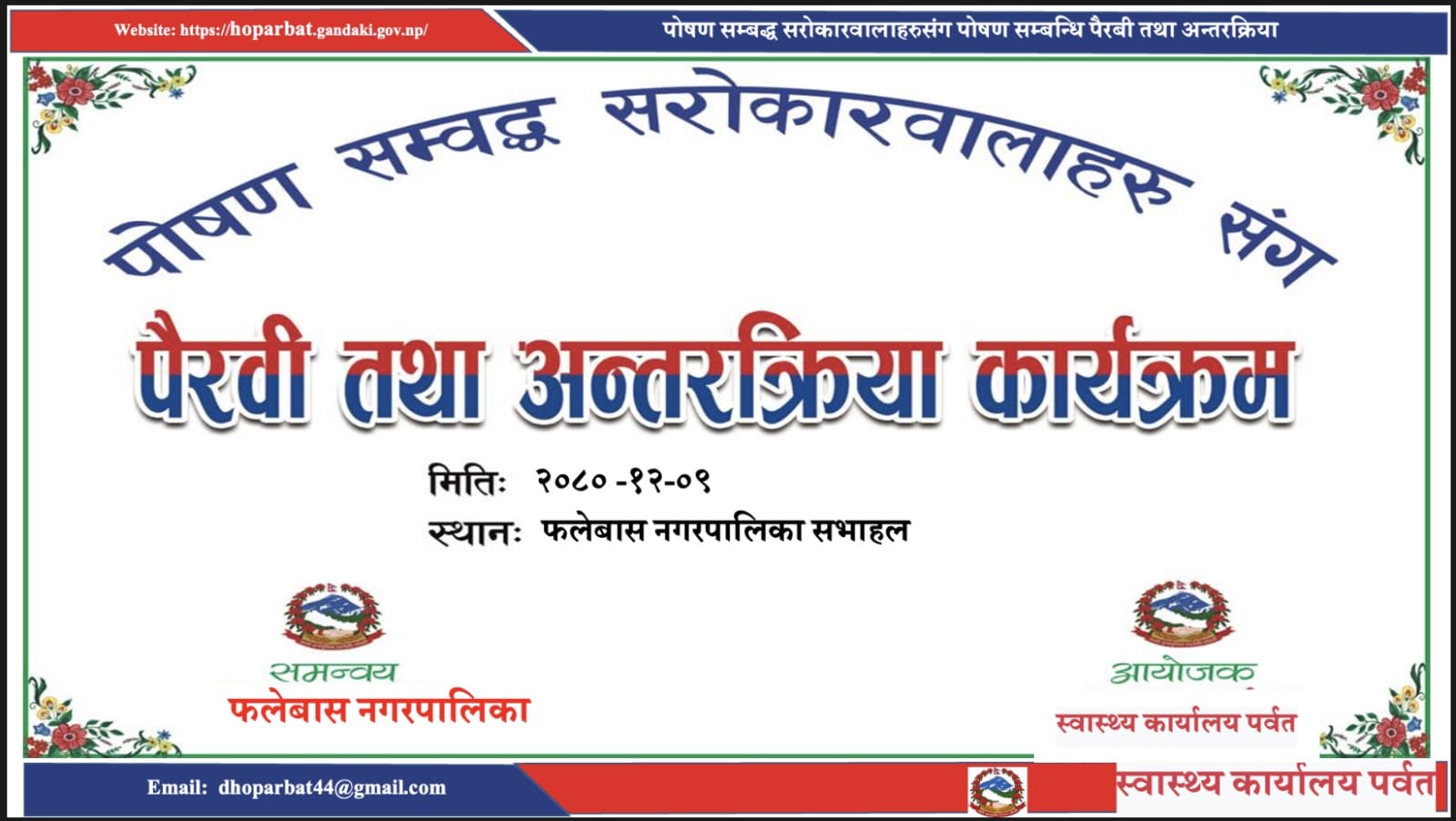 स्वास्थ्य कार्यालय पर्वतकाे आयाेजना र फलेवास नगरपालिकाको समन्वयमा स्थानीय निकायका प्रमुख,उपप्रमुख तथा जनप्रतिनिधि ,शाखा प्रमुख र सराेकारवालाहरू बिच पाेषण पैरवि वैठक तथा अन्तरक्रिया कार्यक्रम फलेवास नगरपालिका प्रमूख गंगाधर तिवारीकाे अध्यक्षतामा सम्पन्न भएकाे छ । उक्त कार्यक्रममा फलेवास नगरपालिकाका उपप्रमुख शोभा कुमारी क्षेत्री , प्र.प्र.अधिकृत ऋषिराम आचार्यको आतिथ्यता रहेको थियो भने जनप्रतिनिधिहरु, कृषि , भेटेनरी, शिक्षा तथा स्वास्थ्य शाखाका प्रतिनिधिहरु र सरोकारवालाहरु गरी ३८ जनाको सहभागितामा रहेको थियो । कार्यक्रमको सहजीकरण स्वास्थ्य कार्यालयका पोषण फोकल व्यक्ति तेज सुवेदी र फलेवास नगरपालिका कृषि अधिकृत केदार सापकोटा गर्नुभएको थियोे।
