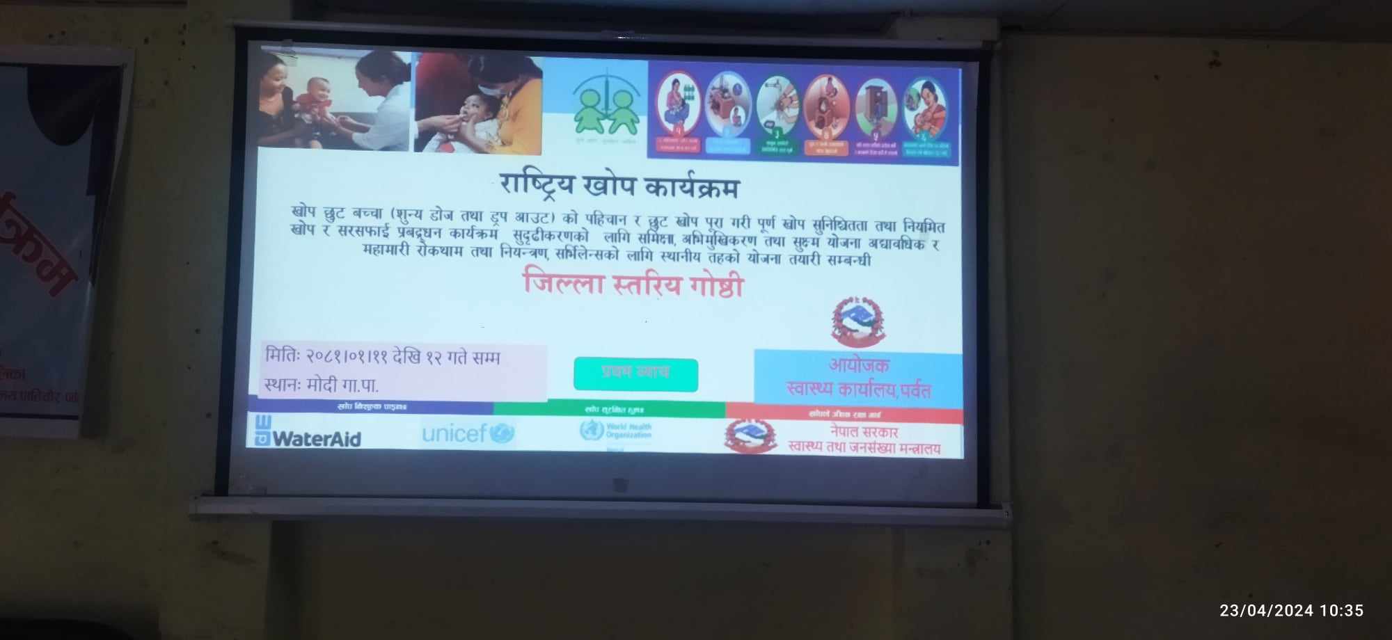 स्वास्थ्य कार्यालय पर्वतको आ. व. २०८०/०८१ काे वार्षिक स्वीकृत कार्यक्रम अनुसार स्वास्थ्य कार्यालय पर्वतको आयोजनामा मिति २०८१/०१/११ र १२ गते मोदी गाउँ पालिकामा विहादी गा पा, पयू गा पा र महाशिला गा.पा. का स्वास्थ्य शाखा प्रमुख, खोप संपर्क व्यक्ति तथा अन्तर्गतका स्वास्थ्य संस्था प्रमुख गरी २७ जनाकाे सहभागितामा खोप छुट बच्चा(शुन्य तथा ड्रप आउट ) काे पहिचान र छुट खोप पूरा गरि पूर्ण खोप सुनिश्चितता तथा नियमित खोप र सरसफाई प्रवर्धन कार्यक्रमकाे सुदृढीकरण का लागी समीक्षा, अभिमुखीकरण तथा शुक्ष्म याेजना अद्यावधिक र महामारी रोकथाम तथा नियन्त्रण यवम सर्भिलेन्स का लागि स्थानिय तहकाे याेजना तयारी सम्बन्धी जिल्ला स्तरीय गोष्ठी सञ्चालन गरियो । सो कार्यक्रमकाे अध्यक्षता स्वस्थ्य कार्यालय पर्वतका कार्यालय प्रमुख श्री प्रबिण शर्माले गर्नु भएको थियो भने सञ्चालन स्वास्थ्य कार्यालय पर्वतका परिवार नियोजन सुपरभाईजर निरीक्षक श्री नारायण प्रसाद रेग्मीले गर्नु भएको थियो। त्यसै गरी कार्यक्रमकाे सहजीकरण स्वास्थ्य निर्देशनालय गण्डकी प्रदेश पोखराका खोप अधिकृत श्री एकनारायण लम्सालले गर्नु भयको थियो। साथै कार्यक्रमकाे व्यवस्थापन स्वास्थ्य कार्यालय पर्वतका कोल्ड चेन निरीक्षक श्री जयन्द्रमान गुरुङ्गले गर्नु भएको थियो।