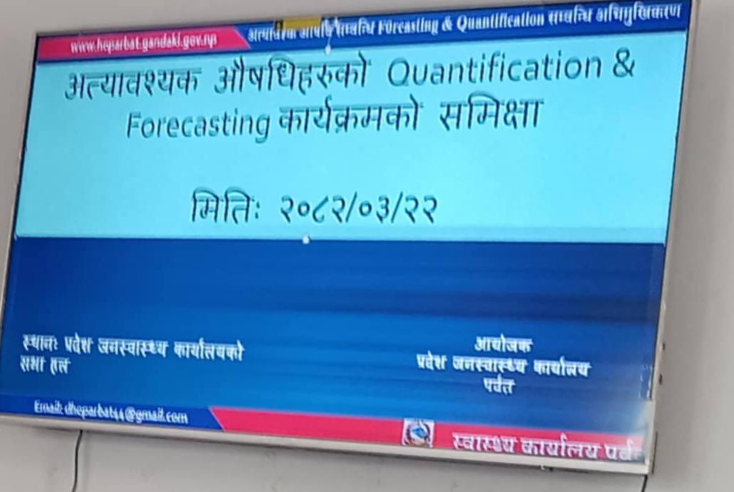 प्रदेश जनस्वास्थ्य कार्यालय कुश्मा पर्वतको आ . व. २०८१/०८२ को वार्षिक स्वीकृत कार्यक्रम अनुसार प्रदेश जनस्वास्थ्य कार्यालय कुश्माकाे तालिम हलमा अत्यावश्यक औषधीको Quantifications and forecasting कार्यक्रमको समीक्षा प्रदेश जनस्वास्थ्य कार्यालय पर्वतका कार्यालय कार्यालय प्रमुख श्री बद्रिराज आचार्यको अध्यक्षतामा सम्पन्न भएको छ । कार्यक्रमको सञ्चालन र सहजीकरण कार्यक्रमका संयोजक प्रदेश जनस्वास्थ्य कार्यालयका जनस्वास्थ्य निरीक्षक श्री प्रकाश गौतमले गर्नु भएको थियो । कार्यक्रममा पर्वत जिल्ला अन्तर्गत सात स्थानीय तह का स्वास्थ्य शाखा प्रमुख र स्टोर फोकल पर्सन गरी १६ जना स्वास्थ्यकर्मीको सहभागिता रहेकाे थियाे ।