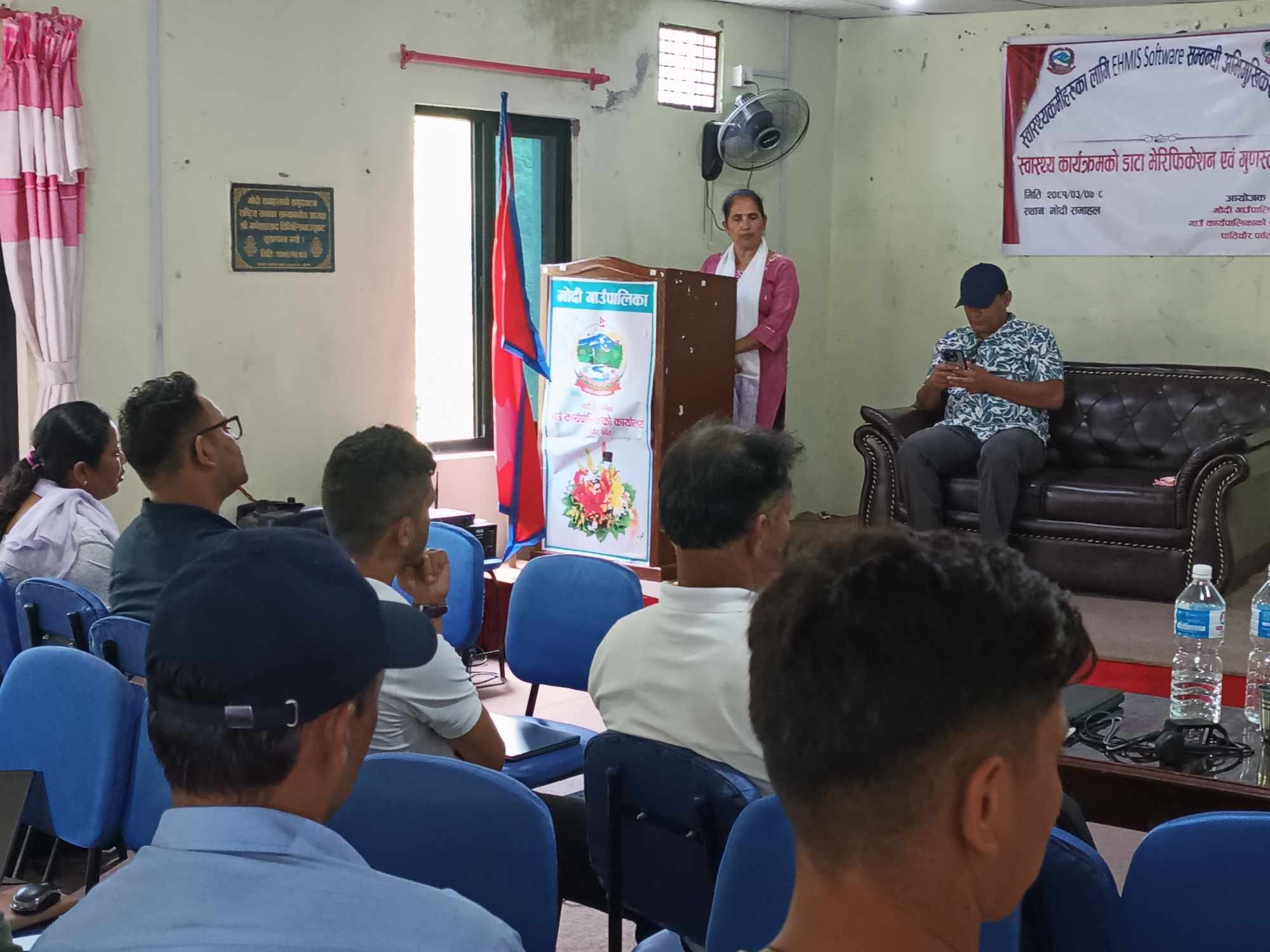 स्वास्थ्य कार्यालय पर्वतको आयोजना तथा मोदी गाउँपालिकाको समन्वयमा स्वास्थ्यकर्मिहरुलाई २ दिने विधुतिय स्वास्थ्य ब्यवस्थापन सुचना प्रणाली(eHMIS) को अभिमुखिकरण कार्यक्रम साथै ८ स्वास्थ्यचौकीहरुमा eHMIS Software को जडान कार्य सम्पन्न भएको छ। कार्यक्रमको समापन सत्रको अध्यक्षता मोदी गा.पाका अध्यक्ष हिरा देवी शर्माज्युले गर्नुभएको थियो भने उपाध्यक्ष बिमल लामिछाने ज्युको पनि उपस्थिति रहेको थियो । कार्यकर्मको सहजिकरण स्वास्थ्य निर्देशनालय गण्डकी प्रदेश पोखराका तथ्याङ्क अधिकृत प्रविण भण्डारी ज्यु र स्वास्थ्य कार्यालय पर्वतका तथ्याङ्क पोकल पर्सन रामचन्द्र सुवेदीले गर्नुभएको थियो भने संचालन मोदी गा.पाका जनस्वास्थ्य निरिक्षक प्रकाश सुवेदीले गर्नुभएको थियो ।कार्यक्रममा मोदी गाउँपालिकाका ८ वटै स्वास्थ्य संस्थावाट पालिका स्वास्थ्य शाखा सहित १९ जनाको सहभागिता रहेको थियो।