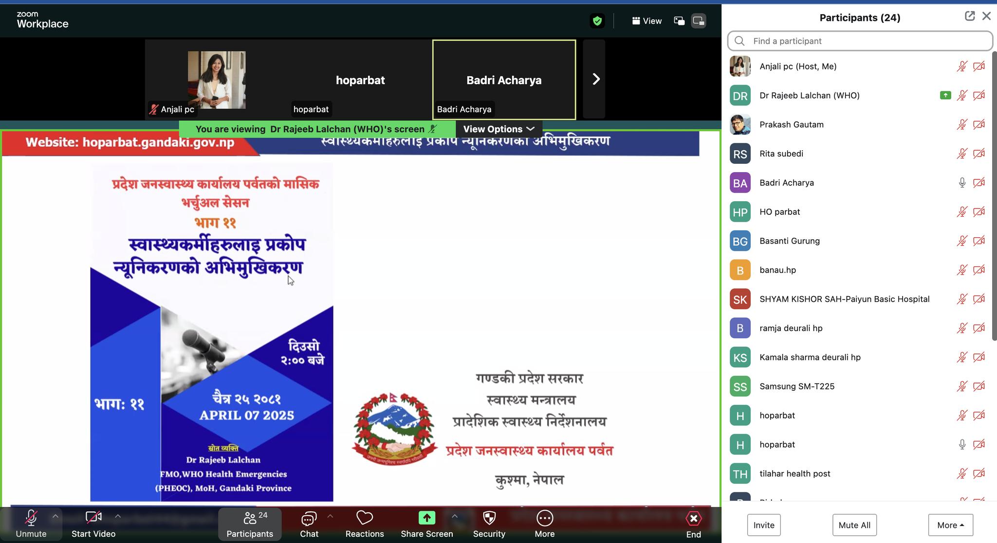 प्रदेश जनस्वास्थ्य कार्यालय पर्वतद्वारा शुन्य लागतमा शुरु भएको मासिक भर्चुअल सेसन भाग ११ अन्तर्गत २०८१ चैत्र महिनाको सेसन MSS मा सम्बन्धित भइ ३.७.४ प्रकोप न्यूनिकरण व्यवस्था को ३.७.४.४ सम्बन्धित भइ "स्वास्थ्यकर्मीहरुलाइ प्रकोप न्यूनिकरणको अभिमुखिकरण " शिर्षकमा प्रदेश जनस्वास्थ्य कार्यालय कुश्मा पर्वतका प्रमुख बद्रिराज आचार्यको अध्यक्षतामा सम्पन्न भएको छ । उक्त सेसनको संचालन प्रदेश जनस्वास्थ्य कार्यालय पर्वतका जनस्वास्थ्य अधिकृत अन्जली पि.सी गर्नु भएको थियो भने सहजीकरण WHO Health Emergencies ,Provincial Health Emergency Operation Center (PHEOC), MoH, Gandaki Province का field Medical officer डा.@Rajeeb Lalchan ले गर्नुभएको थियो । १ घन्टा भन्दा लामो सेसनमा जिल्लाका विभिन्न स्वास्थ्य संस्था बाट जुम आइडी मार्फत करिव ३५ जना भन्दा बढी स्वाथ्यकर्मीहरुको सहभागिता रहेको थियो