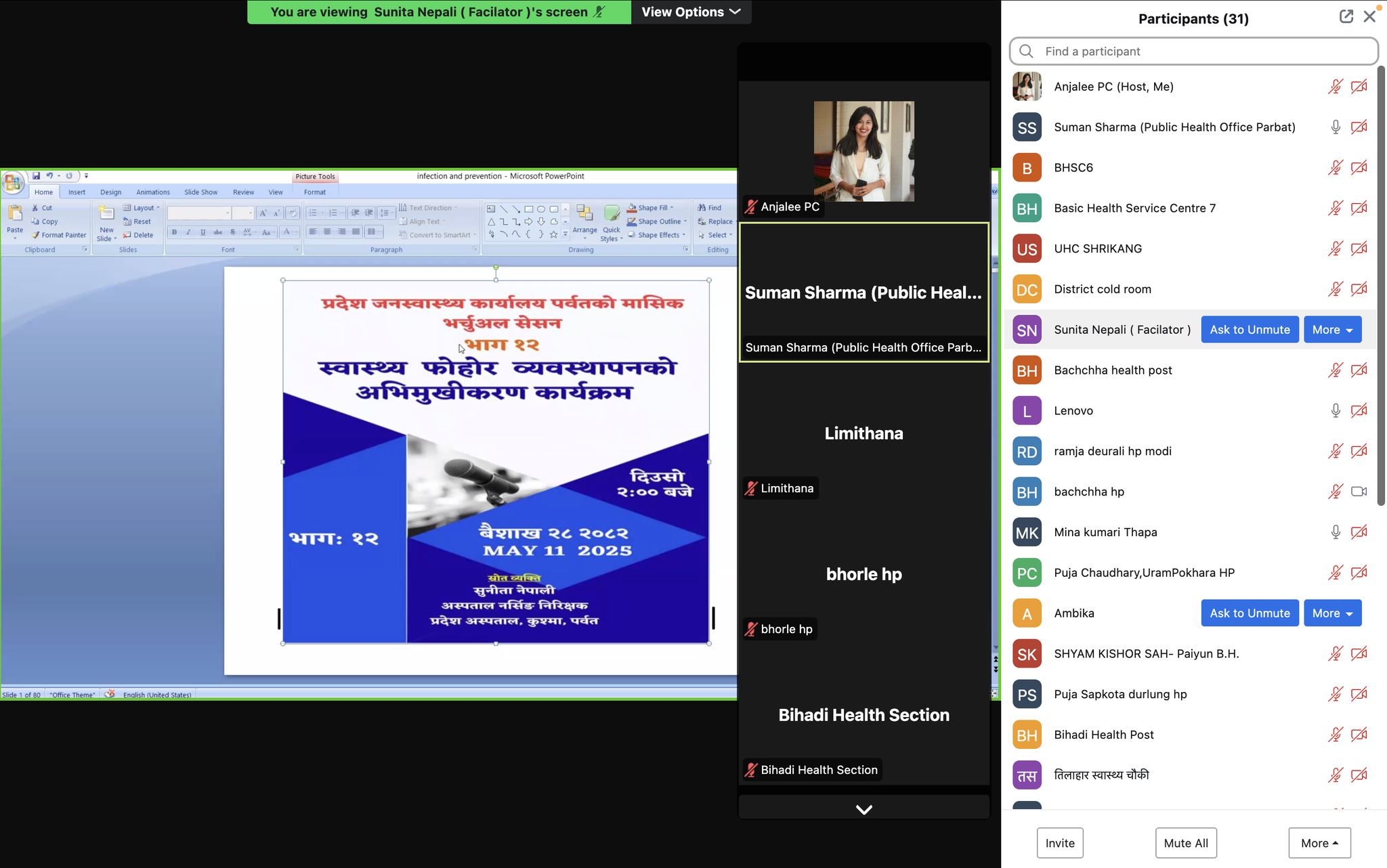 प्रदेश जनस्वास्थ्य कार्यालय पर्वतद्वारा शुन्य लागतमा शुरु भएको मासिक भर्चुअल सेसन भाग १२ अन्तर्गत २०८२ बैशाखको virtual सेसन " स्वास्थ्य फोहोर व्यवस्थापन " शिर्षकमा प्रदेश जनस्वास्थ्य कार्यालय कुश्मा पर्वतका प्रमुख बद्रिराज आचार्यको अध्यक्षतामा सम्पन्न भएको छ । उक्त सेसनको संचालन प्रदेश जनस्वास्थ्य कार्यालय पर्वतका प.हे. न. नि सुमन शर्मा र जनस्वास्थ्य अधिकृत अन्जली पि.सी गर्नु भएको थियो भने सहजीकरण प्रदेश अस्पताल, कुश्मा, पर्वत अस्पताल नर्सिङ निरिक्षक सुनीता नेपालीले गर्नुभएको थियो । १ घन्टा भन्दा लामो सेसनमा जिल्लाका विभिन्न स्वास्थ्य संस्था बाट जुम आइडी मार्फत करिव ४० जना भन्दा बढी स्वाथ्यकर्मीहरुको सहभागिता रहेको थियो ।