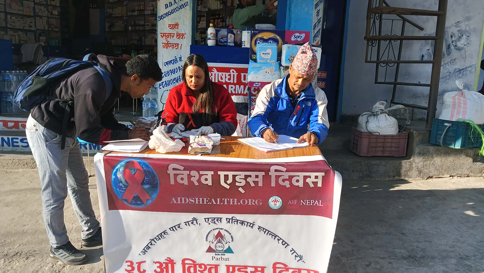 प्रदेश जनस्वास्थ्य कार्यालय पर्वत काे आयाेजना र CSG पर्वत, कुश्मा नगरपालिका,प्रदेश अस्पतालकाे समन्वयमा ३८ औ विश्व एड्स दिवस मनाउने कार्य सम्पन्न भयो। एच,आइ,भि,एड्स सम्बन्धी जानकारीमुलक कार्यक्रम ,पर्चा बितरण,कण्डम बितरण तथा एच.आइ.भी रक्त नमुना परीक्षण गरी मनाइएको साे कार्यक्रममा ५१ सहभागीता रहेको थियो । कार्यक्रममा १० जनाको रक्त परीक्षण गरीएको थियाे । रक्त परीक्षण गरीएका सबै नमुना नेगेटिभ पाइएको थियाे । कुश्मा बजारकाे शिवालय चाेकमा सन्चालन गरीएको साे कार्यक्रममा जनप्रतिनिधि, कर्मचारी,सवारीचालक र सर्वसाधारण काे सहभागिता रहेका थियाे ।