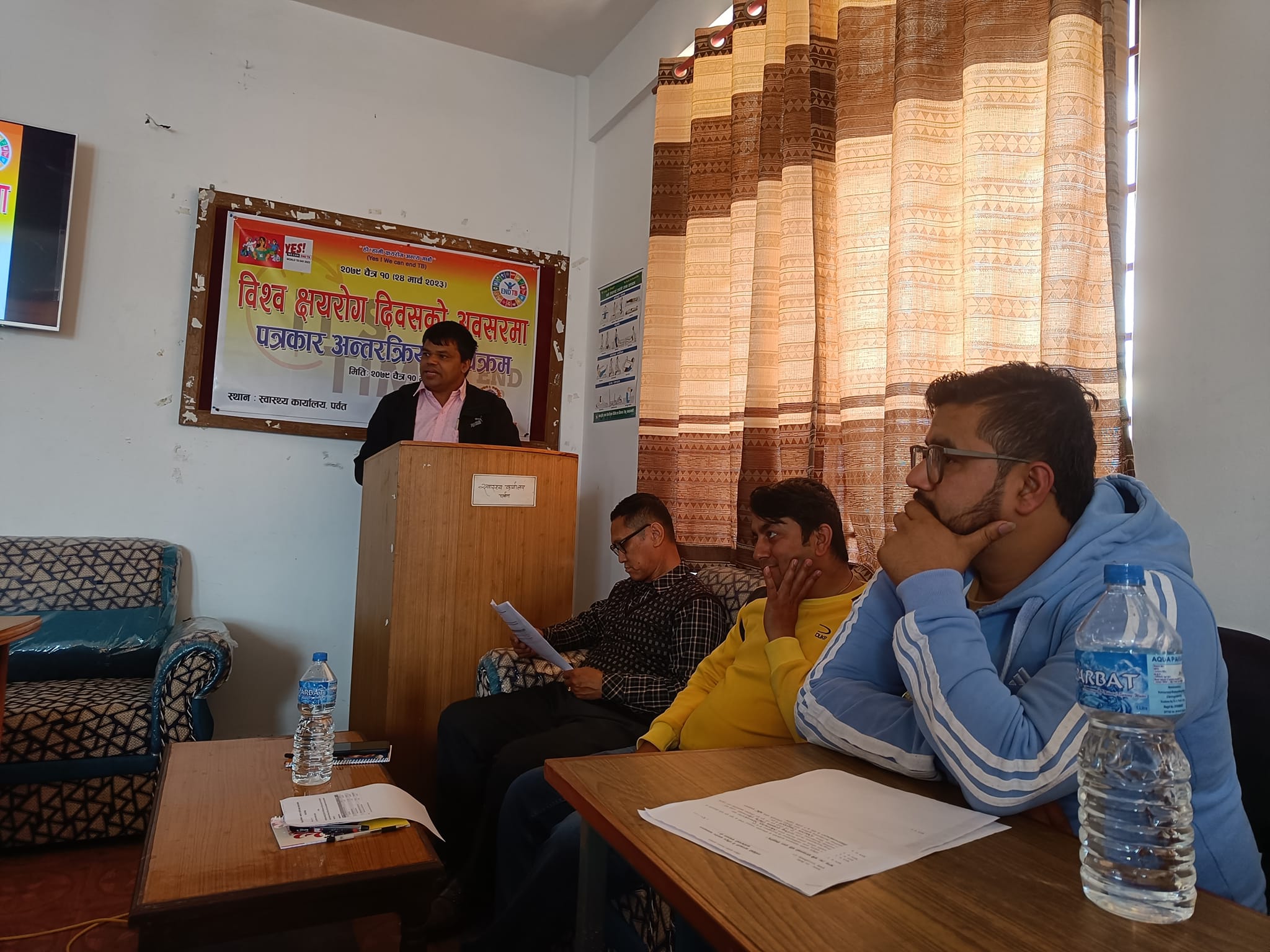 पर्वतमा क्रियाशिल पत्रकारहरु र स्वस्थ्यकर्मी विच भएको अन्तरक्रिया कार्यक्रममा जिल्ला अस्पताल पर्वतका डा.दिपक रेग्मीले क्षयरोगको वारेमा जानकारी गराउदै नेपालमा क्षयरोगको वर्तमान अवस्थाको वारेमा सहजिकरण गर्नुभएको थियो ।