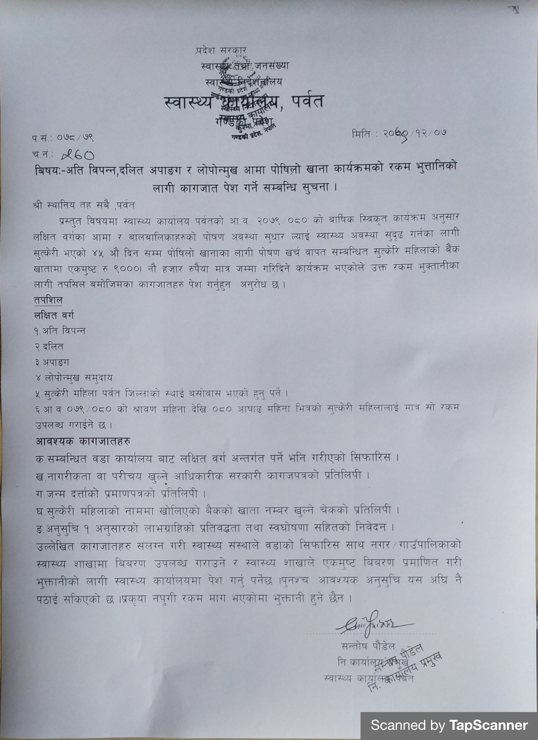 विशेष अनुदान तर्फको आमा तथा बालबालिकाको पोषण सुधार आयोजना सम्बन्धी सुचना