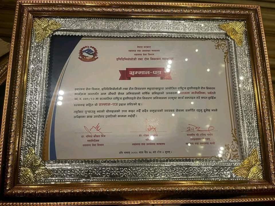 आर्थिक वर्ष २०७९/०८० अन्तर्गत नेपाल सरकारले संचालन गरेको "राष्ट्रिय हात्तिपाइले रोग निवारण अभियान "लाई सफल पार्नको लागि जलजला गाउँपालिकाले खेलेको उत्कृष्ट भुमिकाको कदर गर्दै स्वास्थ्य तथा जनसंख्या मन्त्रालयले आज आयोजना गरेको एक कार्यक्रमका बिच नेपाल सरकारका उपप्रधान, स्वास्थ्य तथा जनसङ्ख्या मन्त्री माननिय उपेन्द्र यादब ज्युले जलजला गाउँपालिका अध्यक्ष श्री राजु प्रसाद आचार्य ज्युलाई सम्मान पत्र प्रदान गर्नु भएको छ। इपिडिमियोलोजी तथा रोग नियन्त्रण महाशाखा तथा विश्व स्वास्थ्य संगठन नेपाल द्वारा गरिएको मुल्याकंन अन्तर्गत पर्वत जिल्लाको जलजला गाउँ पालिका उत्कृष्ट पालिकाको रूपमा छनौट भएको हो। यो अभियान उत्कृष्टताका साथ सफल बनाउन अहोरात्र खट्नुहुने पालिकाका सम्पुर्ण जनप्रतिनिधि ज्यु, स्वास्थ्य शाखामा कार्यरत कर्मचारी ,स्वास्थ्य संस्थामा कार्यरत सम्पुर्ण स्वास्थ्यकर्मी तथा अन्य शिक्षककर्मी, महिला स्वास्थ्य स्वयम् सेबिका ज्युहरु एवं स्वास्थ्य कार्यलय पर्बतका कर्मचारी लगायत सहयोग गर्नुहुने सम्पुर्णमा हार्दिक आभार प्रकट गर्दछौI