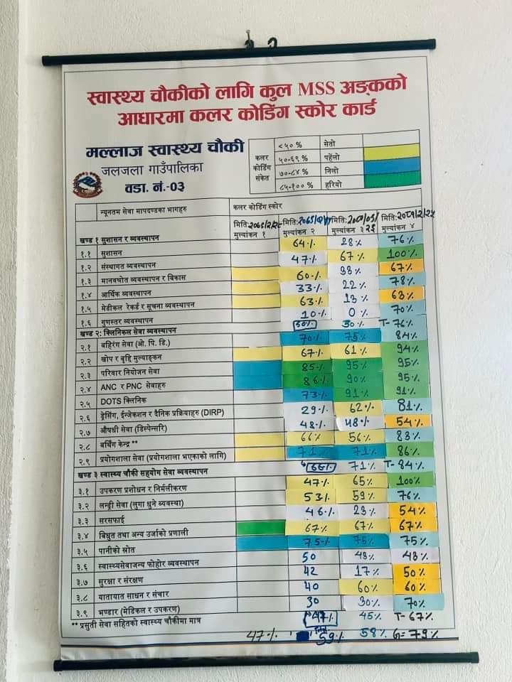 मिति २०८१/०२/२५ गते जलजला गाउँपालिकाको आयोजना ,वान हार्ट वल्ड वाईड को प्राविधिक सहयोग ,मल्लाज स्वास्थ्य चौकिको समन्वयमा स्वास्थ्य चौकी ब्यबस्थापनका अध्यक्ष श्री एकिन्द्र खत्री ज्यु को अध्यक्षतामा न्युनत्तम सेवा मापदण्ड कार्यक्रमको चौथो मुल्यांकन सम्पन्न भएको छ। मुल्यांकनमा संस्थाको स्कोर ५८% बाट ७९% पुगेको छ। यहाँ सम्म ल्याउनको लागि साथ सहयोग गर्नुहुने सम्पुर्ण ब्यबस्थापन समितिका पदाधिकारिहरु , स्वास्थ्य शाखा एबम् स्वास्थ्य सस्थामा कार्यरत स्वास्थकर्मी हरुमा आभार व्यक्त गर्दछौं|